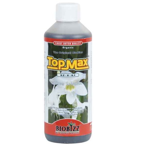 TopMax is a 100-Percent organic flowering strengthener which has the threefold purpose of dramatically increasing the actual size and weight of clusters of flowers, leaving a sweet, smooth taste in the finished product and facilitating the uptake of nutrients by the plants. It has been specially developed for use in combination with BioBizz soil mixtures.The extraordinary way TopMax assists in the flow of nutrients is made possible through the use of humic acids, which are formed over millions of-year by deposits of vegetables and soil. Its main source is a deposit called Leonardite, which is the material with greatest organic concentration on the planet. Leonardite was formed from trees and vegetation that grew, flourished and died during the carboniferous period 300 million-year ago.Fulvic acids are responsible for healthy floral growth. The are reclaimed from certain exceptionally rich sources of humate deposits found deep within the earth. They contain a natural electrical charge which attracts nutrients and minerals from both the microbiological soil base and the applied organic fertilizers. Due to its particular properties, it is responsible, together with humic acids, for contributing energy to old cells and stimulating new ones.To benefit from the optimal performance from TopMax, supply it to your plants independently. Add Bio-Grow, Bio-Bloom, Alg-A-Mic or any other nutrient you use regularly, then wait for a couple of minutes and add TopMax.This ensures that the plant absorbs all the nutrients that are contained in the soil and not only in the liquid, thereby reaching all parts of the plant to achieve abundant and full bloom.